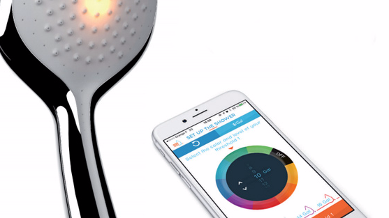 Un pommeau de douche permettant de mesurer la consommation d’eau des douches et qui se synchronise à une application de gestion.